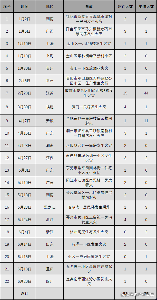 根据消防产业智库《2024上半年火灾事故统计分析报告》,2024年上半年住宅消防火灾事故有伤亡的共统计22起,死亡52人、受伤75人。